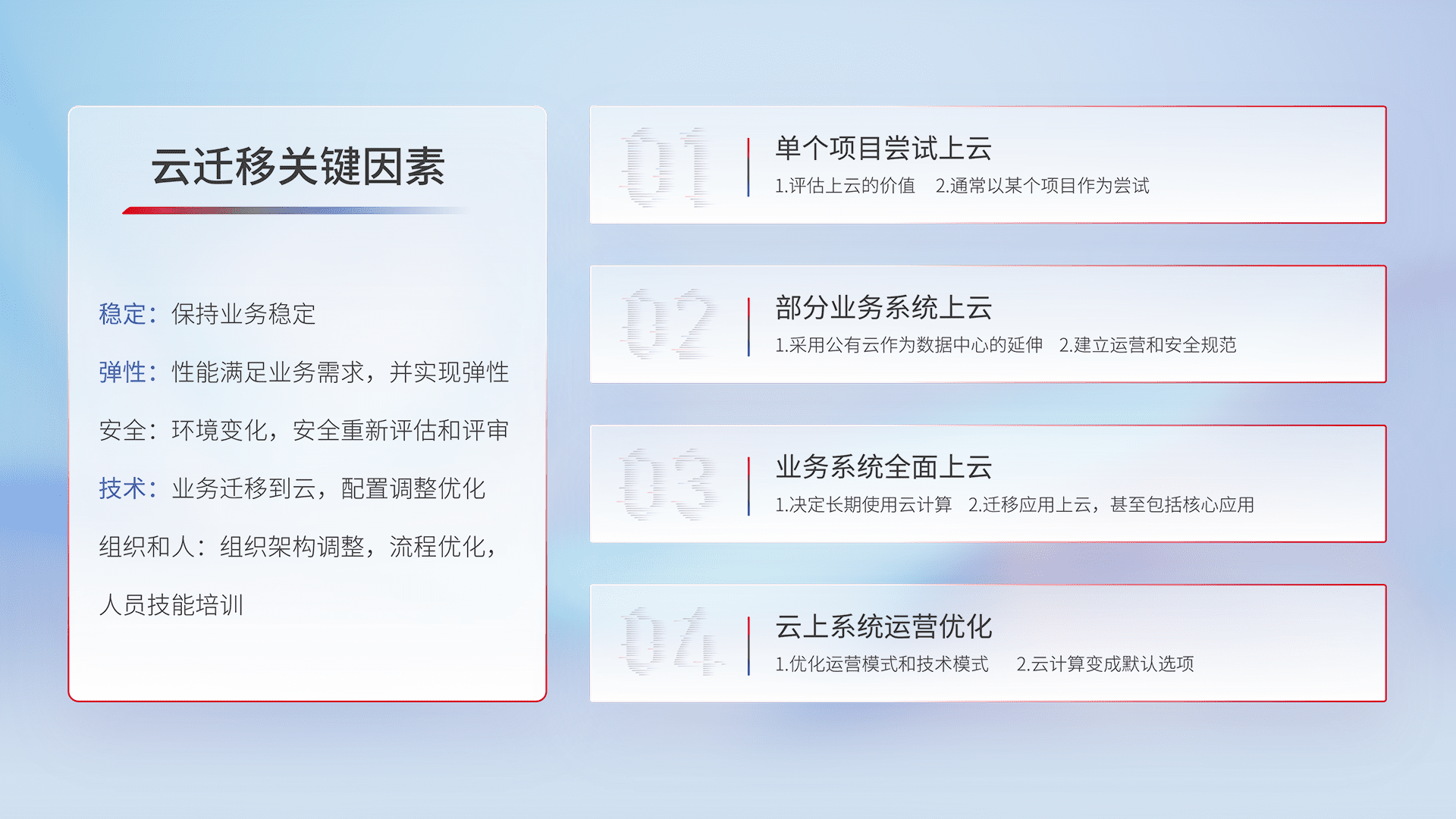 结合实际业务,,,,从规划设计、、、、云平台选型、、云原生改造、、、、数据迁移、、集成交付,,,迁移全过程为客户识别最佳上云路径,,做好风险识别管理,,,设计网络架构、、、、身份权限、、、安全审计合规、、、、操作审计、、、、日志审计、、、、监控告警策略、、、、多站点容灾设计等,,,对云上基础设施进行整体规划,,提升IT治理水平,,以满足弹性、、、高可用、、高性能的需求。。